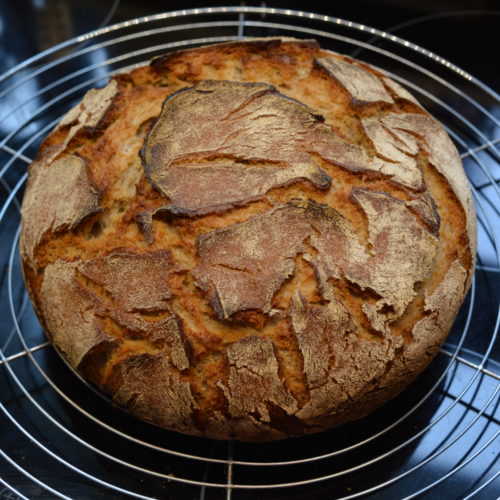 - Den Topf aus dem Ofen nehmen und das fertige Brot auf einem Gitter zum Auskühlen ablegen.